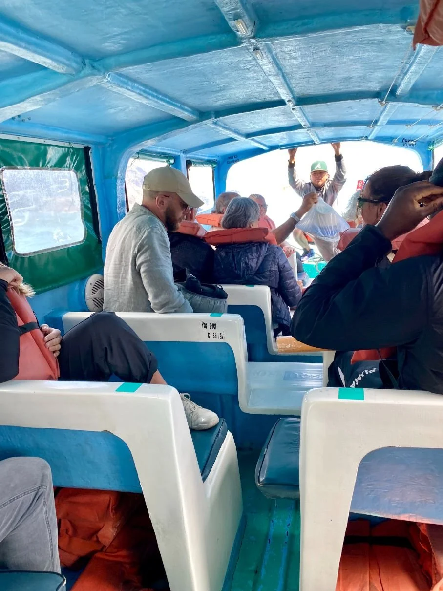 Whereas the journey across had been reasonably placid, the anchored boats are now bouncing around on the surging waters. Aquilino talks to the skipper and then beckons us all to get on the boat. There’s an increasing degree of worry etched on many of our faces, with Coman in particular not a happy person on rough waters. Everyone is instructed that they must wear a life jacket and we are redistributed around the boat for the weight.
