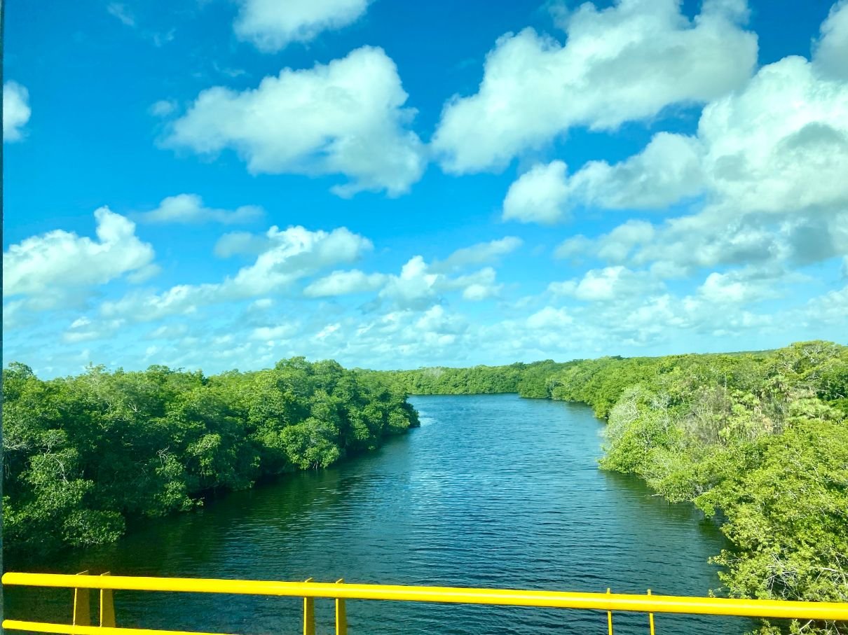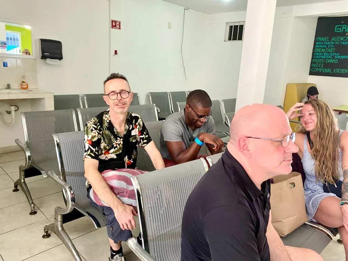 We’re all ferried by minibus to to a small office in the south of Chetumal where we fill in our Belize entry forms in advance. There’s various other tourists there doing the same, all much younger independent backpackers, so our Intrepid group are instructed by Aquilino that when we get to the border we must all stick together and he’ll smooth out any issues. Once our forms are filled in everyone, including the independent travellers, are put onto a larger coach and we are driven to the Mexican border, where we each have to hand over 680 pesos to leave the country, seemingly an arbitrary figure which fluctuates with whatever guard is on duty.