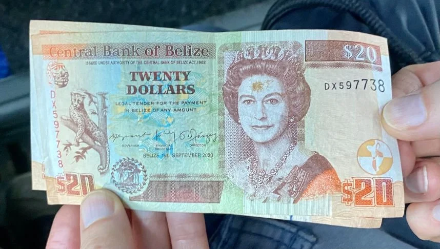 We all get back on the coach and drive six minutes through no man’s land, across a river that creates a natural border, to Belizean immigration where big bright blue entry permits are stamped into our passports, bags are randomly searched and we all pile out of the immigration huts. Aquilino points out the local ‘money exchange bureau’, which is just a random guy in a baseball cap on the other side of a chain link fence with a bundle of notes. I hand over our remaining 500 Mexican pesos and get 50 Belize dollars in return, the notes bearing a picture of a much younger Queen Elizabeth II on them.