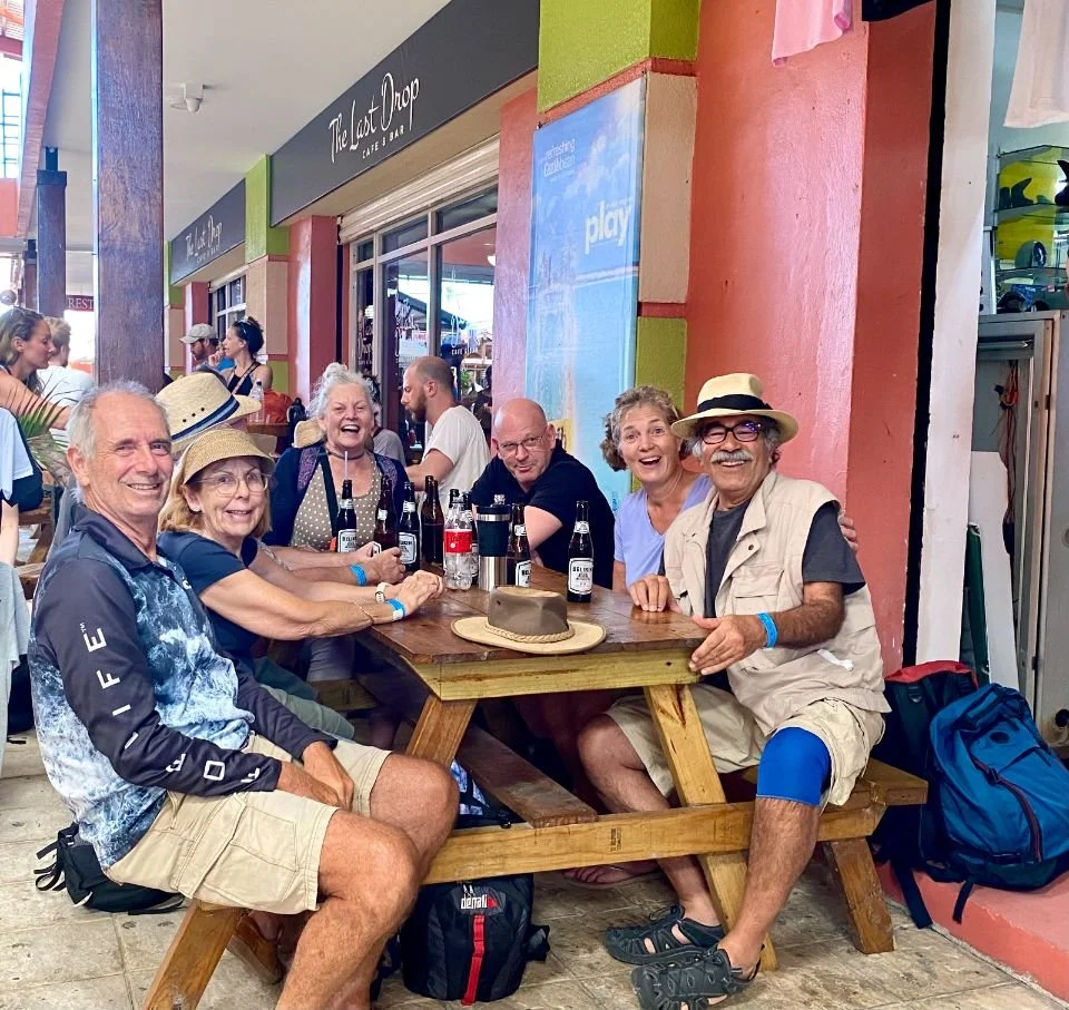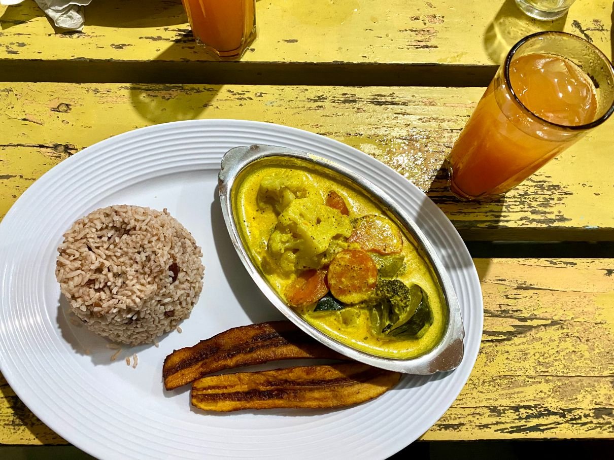 Nevertheless after a walk around the main streets with Aquilino and the group we join everyone for dinner at Maggie’s Sunset Kitchen where we watch the sun sink into the sea. Our fellow travellers order jerk chicken and grilled lobster, and we enjoy a coconut curry and veggie kebabs. Thankfully it’s happy hour on rum punch so everyone tucks into the two-for-one deal and a fine evening is had by all.