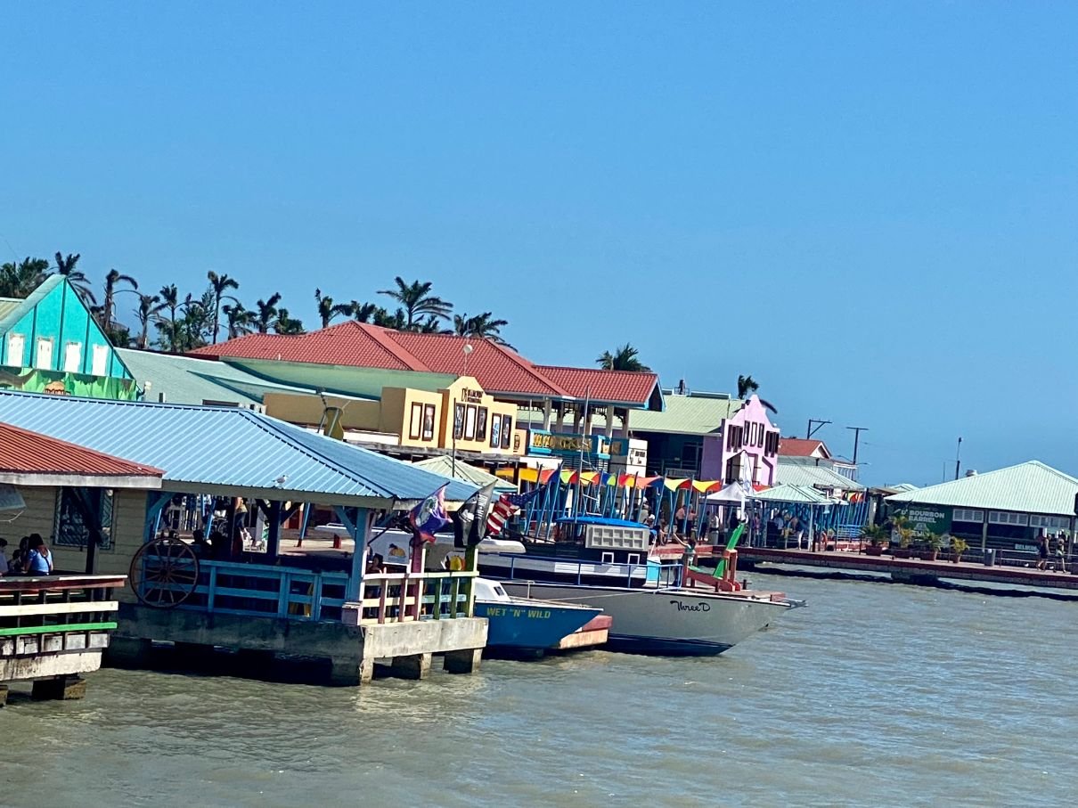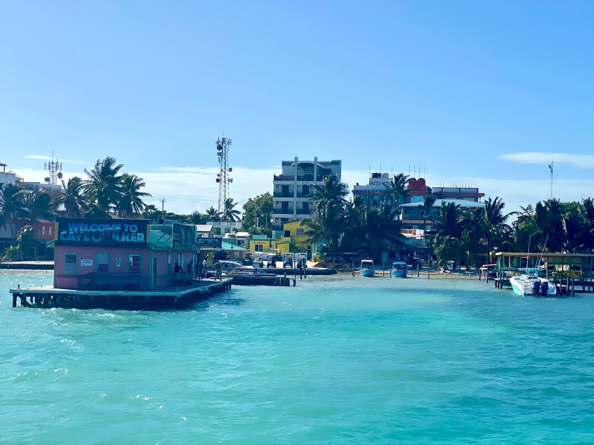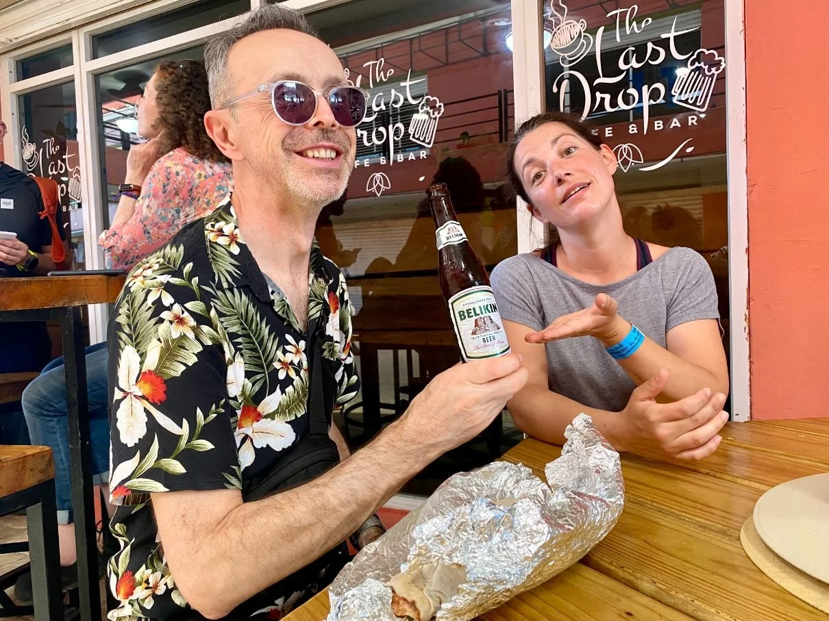 Taking our bags from the minibus we walk in quick file from the parking lot into the terminal and all wait at The Last Drop Café, drinking Belikin, the national beer, and eating burritos until our Belize Express boat is ready to depart. It serves San Pedro, a large town on Ambergris Caye but stops first at our destination, the smaller and quieter Caye Caulker. We take a seat on top of the water taxi, smothered in factor 50 against the burning sun, and in just over an hour we dock at the jetty of the idyllic island.