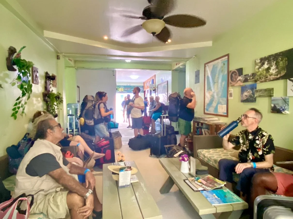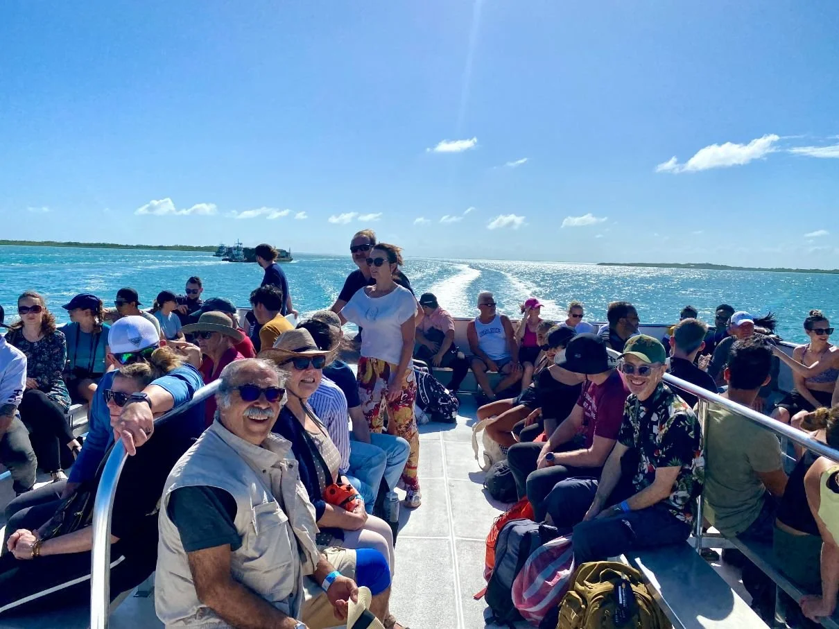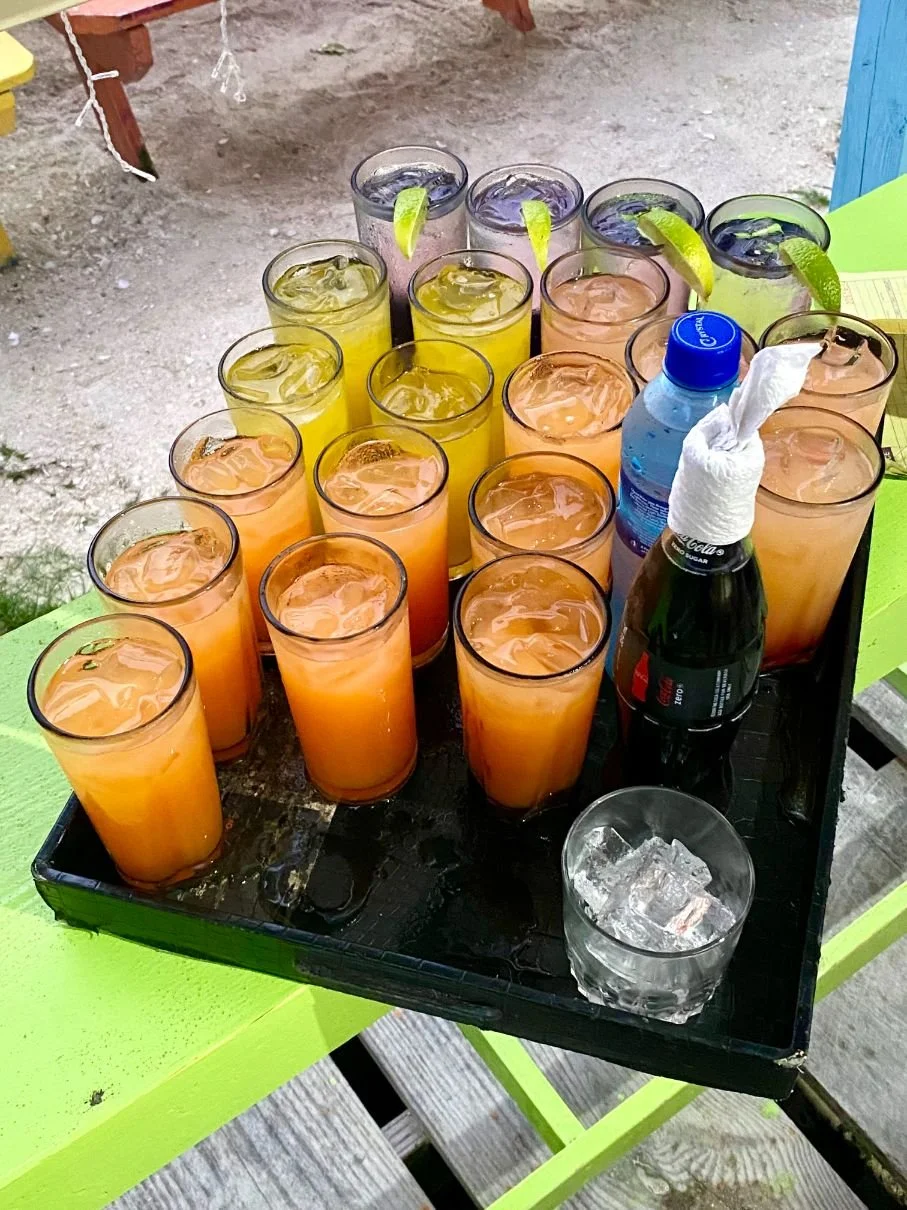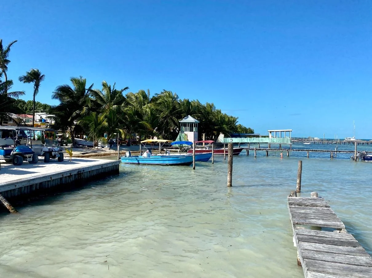 Taking our bags from the minibus we walk in quick file from the parking lot into the terminal and all wait at The Last Drop Café, drinking Belikin, the national beer, and eating burritos until our Belize Express boat is ready to depart. It serves San Pedro, a large town on Ambergris Caye but stops first at our destination, the smaller and quieter Caye Caulker. We take a seat on top of the water taxi, smothered in factor 50 against the burning sun, and in just over an hour we dock at the jetty of the idyllic island.
