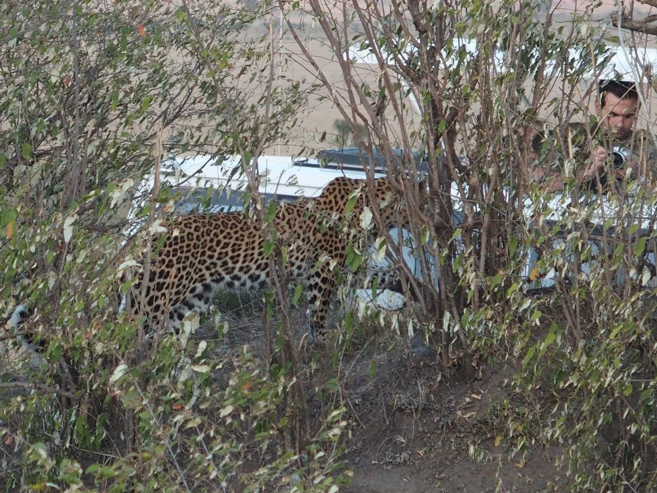 We're stuck, but another driver manoeuvres his vehicle behind us and revving his engine manages to push us free. In the commotion the leopard is lost but suddenly I spot him. Martin lurches forward yet none of our cameras can refocus in time and our clear view disappears, as the leopard becomes camouflaged once more. We head off while ten other vehicles circle the copse, all trying to catch a glimpse.