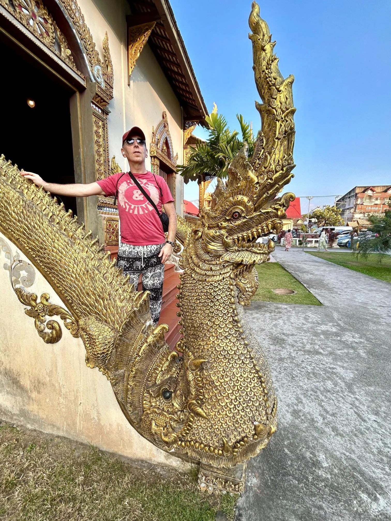 Dusk is falling as we reach Wat Muentoom and the nearby Wat Chedi Luang, which is high on the list for us to see, but the crowds outside the temple are immense and there’s a heavy police presence. It transpires that King Rama X and the Queen are paying a royal visit to Chiang Mai today and have been giving alms to the poor before praying at this very temple.
